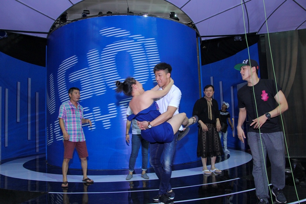 Trấn Thành gồng mình trong lúc bê đỡ Việt Hương. Các trưởng phòng có tiết mục chào sân ấn tượng trong mỗi tập. |