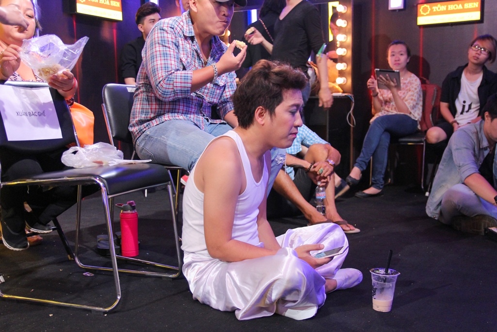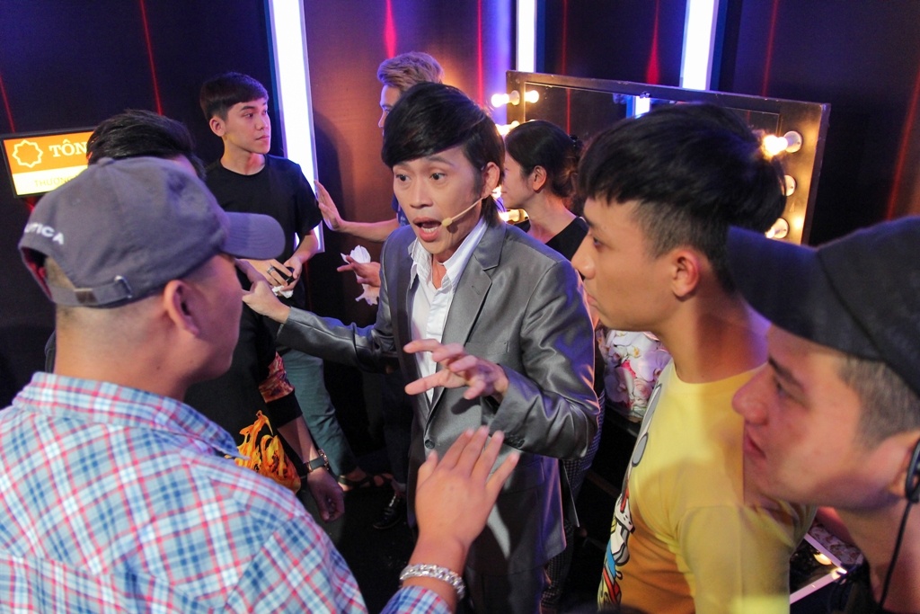 Trong lúc nhân viên hậu đài làm tóc, Việt Hương tranh thủ trò chuyện cùng đồng nghiệp. Sự tung hứng của Việt Hương trên sân khấu nhiều lần làm khó các khách mời. Hoài Linh cũng thừa nhận, dù diễn chung nhiều lần nhưng người em thân thiết luôn làm anh "đứng hình" vì mảng miếng riêng. |