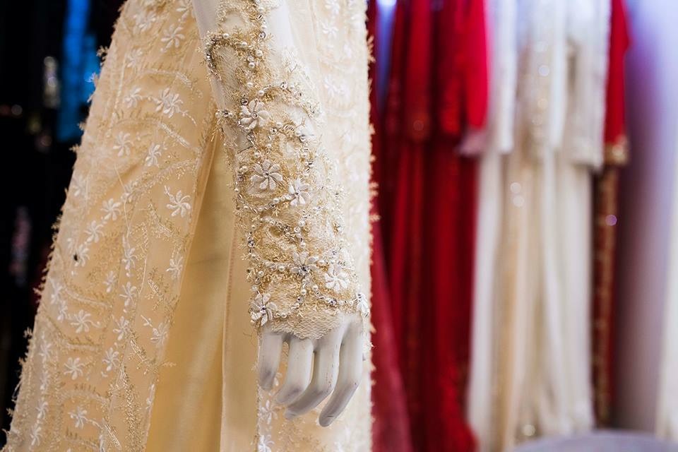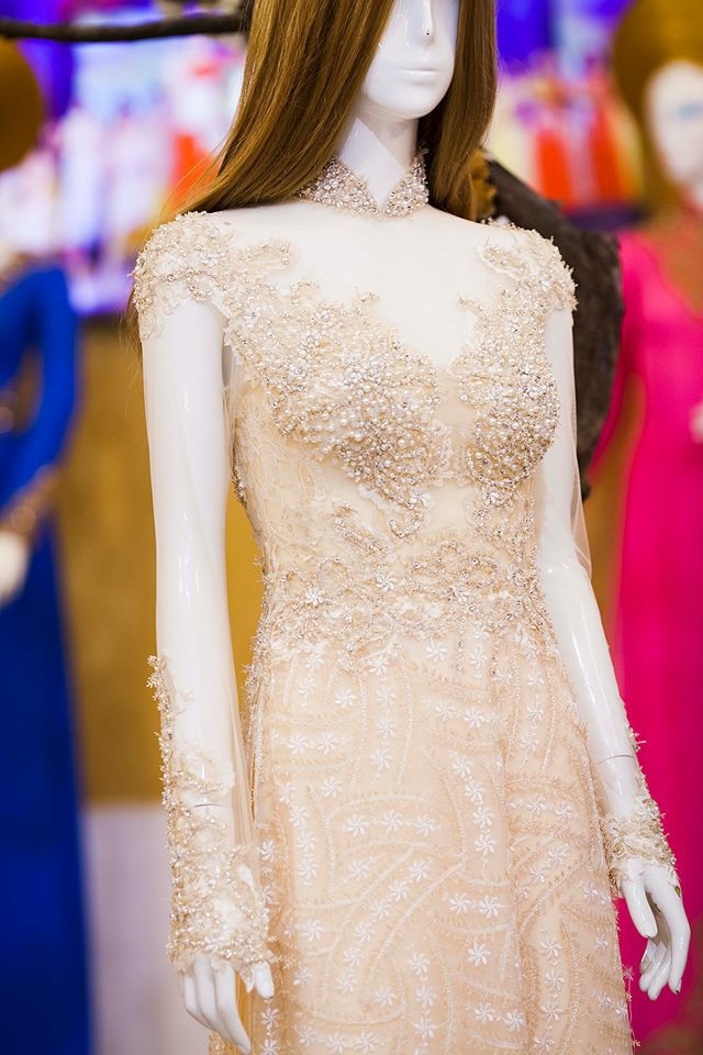Hầu hết, các thiết kế đều ứng dụng phương pháp đính hoa ren 3D nổi bật trên thân áo, tạo vẻ đẹp kiêu kì, sang trọng. Xen kẽ hoa ren là hạt ngọc trai kết tỉ mỉ trên thân áo, tay áo và cổ áo, tạo điểm nhấn nhá.