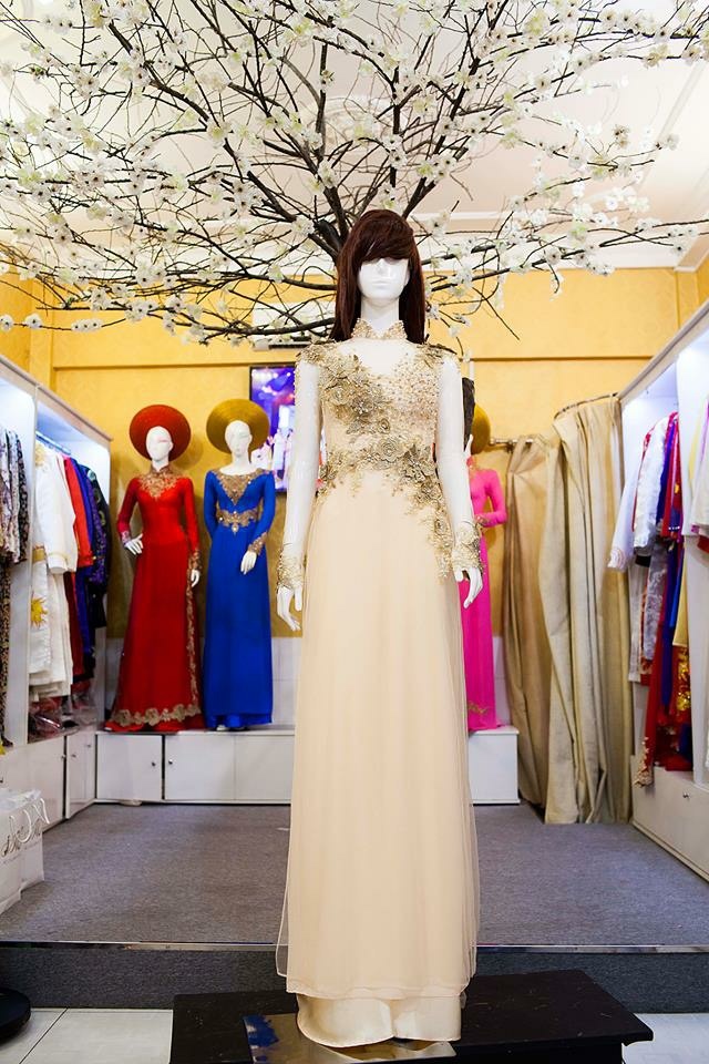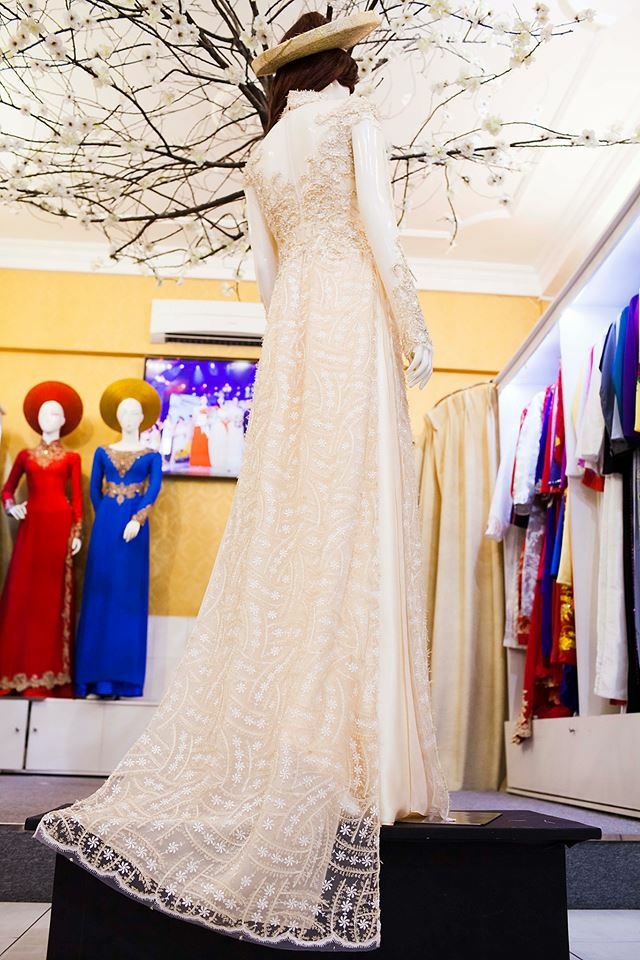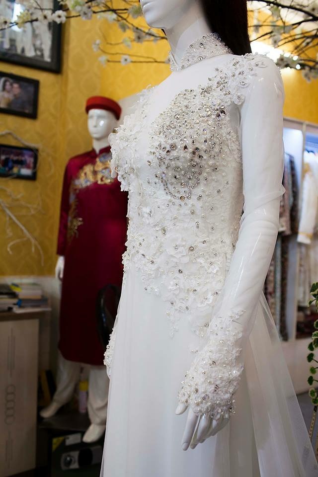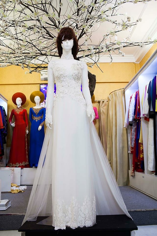 | Sao với hai thiết kế trên, mẫu áo dài thứ 3 có phần đơn giản hơn ở kiểu dáng, tà áo cũng được làm gọn, tôn nét đẹp hiện đại, thanh lịch cho cô dâu trong ngày trọng đại. |