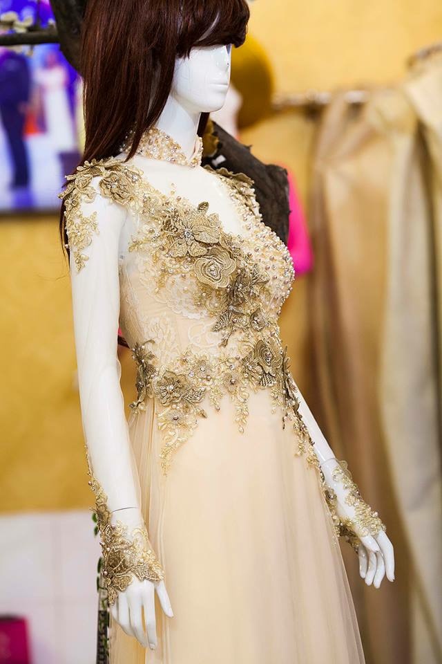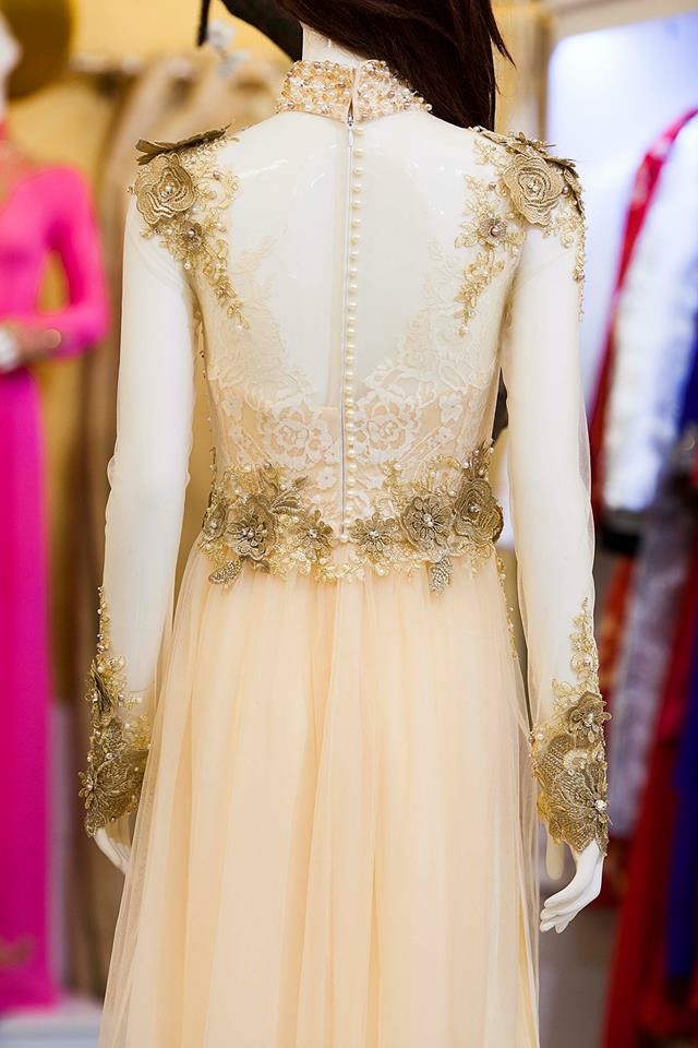 | Thiết kế thứ 3 cũng được đính hoa nổi tinh tế. Trang phục có gam màu vàng pastel nhã nhặn được kết hoa vàng đồng, bắt mắt. |