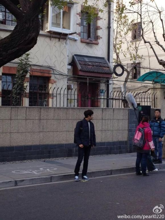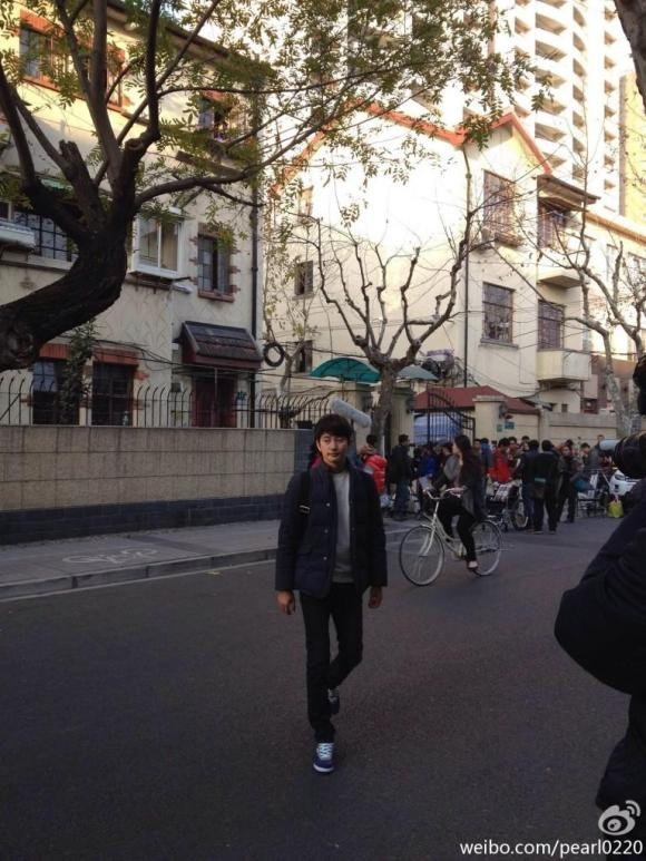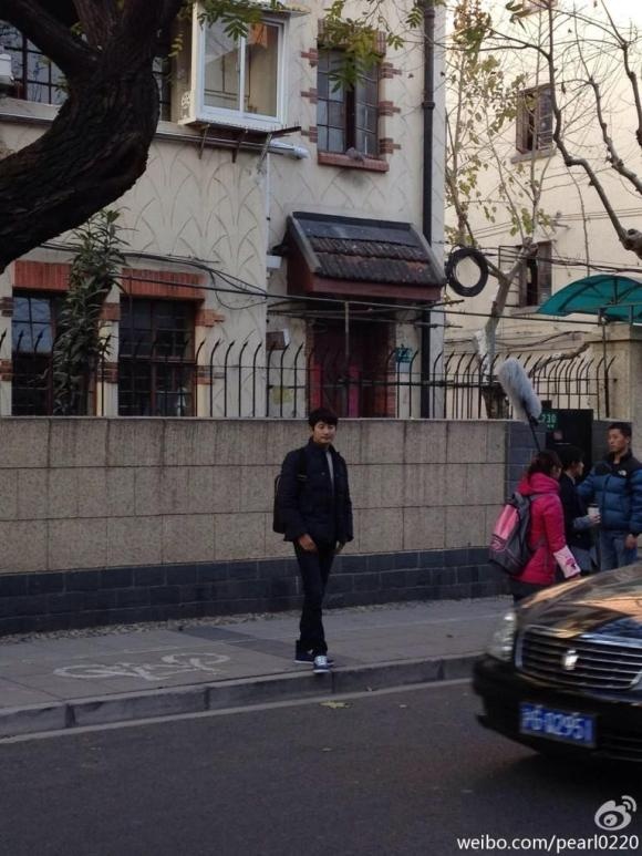 Park Shi Hoo giản dị với chiếc áo khoác màu cà phê nhạt. Phía xa là hàng trăm fan đang đứng chờ xem cảnh quay của anh.