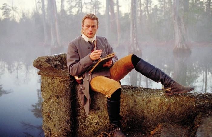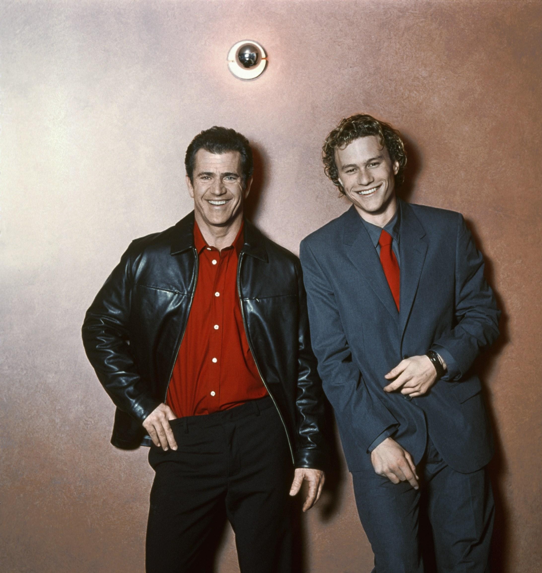 | Heath Ledger bên cạnh Mel Gibson trong một buổi chụp hình quảng bá cho The Patriot (2000). |