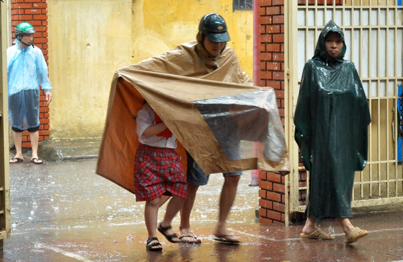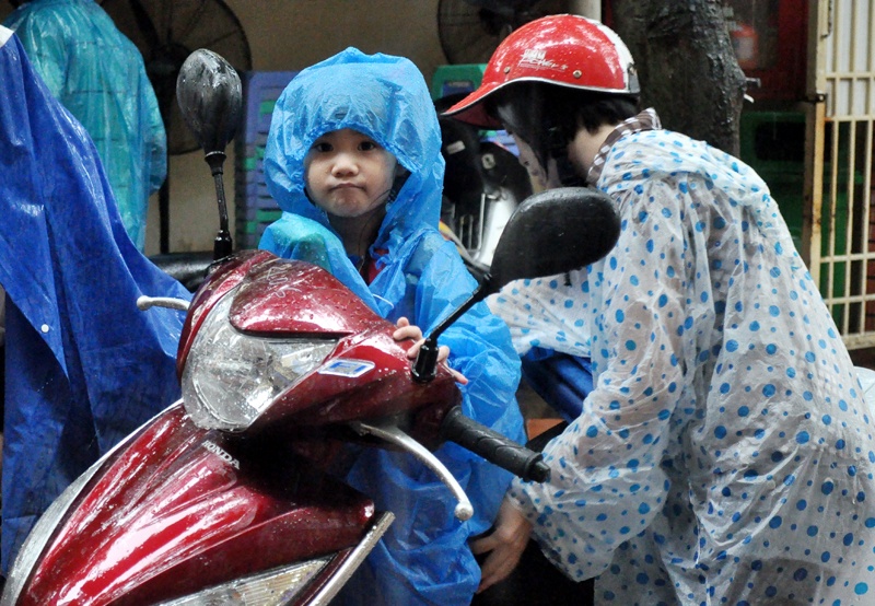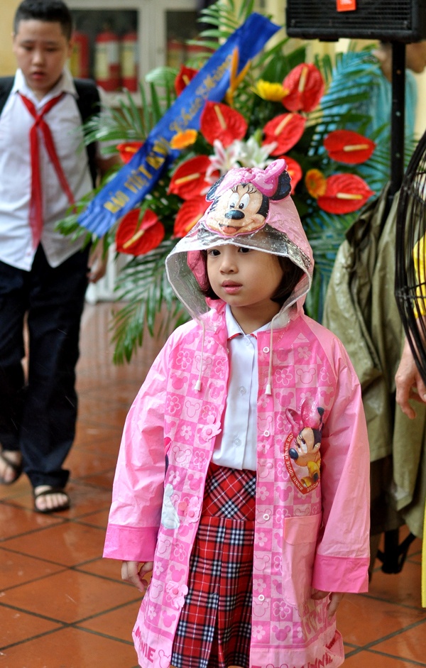 | Dù cơn mưa khá lớn nhưng các bé vẫn mặc đồng phục rất chỉnh tề, được bố mẹ che chắn kỹ. |