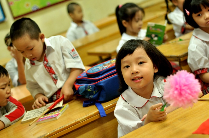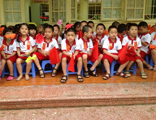 | "Heo vàng" tại trường tiểu học Khương Mai (Thanh Xuân) cũng phải ngồi trên bậc thềm của lớp học để dự lễ khai giảng. |