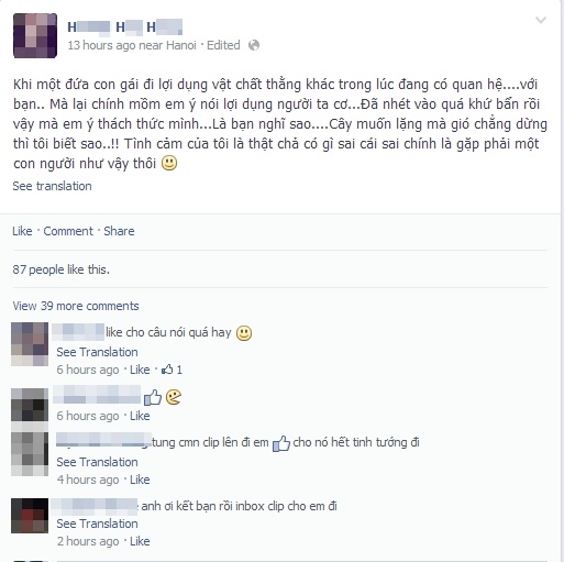 "Khi một đứa con gái đi lợi dụng vật chất thằng khác trong lúc đang có quan hệ với bạn, mà lại chính mồm em ý nói lợi dụng người ta cơ. Đã nhét vào quá khứ bẩn rồi vậy mà em ý thách thức mình... Là bạn nghĩ sao... Cây muốn lặng mà gió chẳng dừng thì tôi biết sao? Tình cảm của tôi là thật chả có gì sai cái sai chính là gặp phải một con người như vậy thôi".