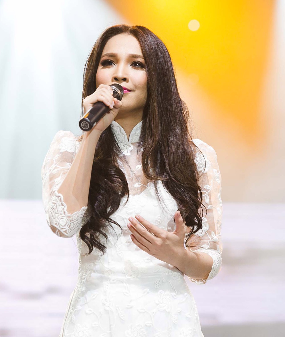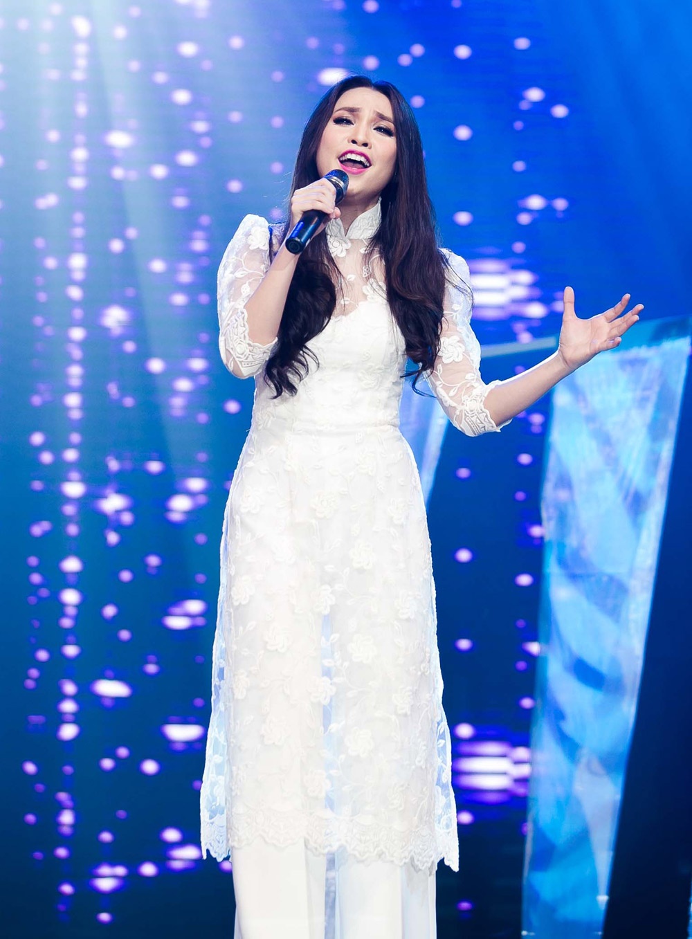 | Bà mẹ một con nhanh chóng thay chiếc áo dài trắng, phần trên kết hợp ren giúp nữ ca sĩ trông nữ tính và không kém phần gợi cảm. |