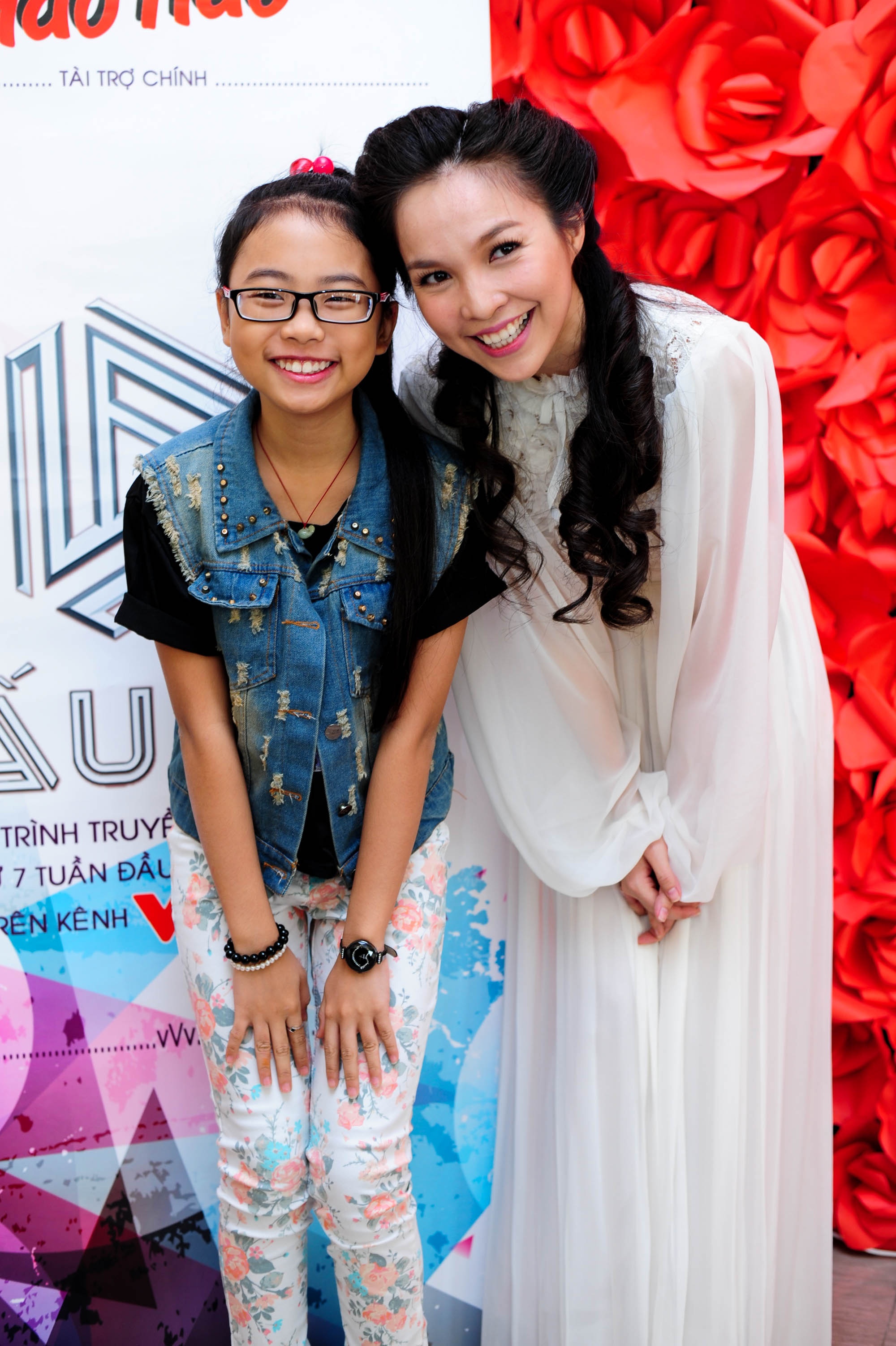 | Phương Mỹ Chi rụt rè trước những câu hỏi của giới truyền thông dành cho mình. Vì sợ học trò mất bình tĩnh, Hiền Thục đứng sau lưng đỡ lời. |