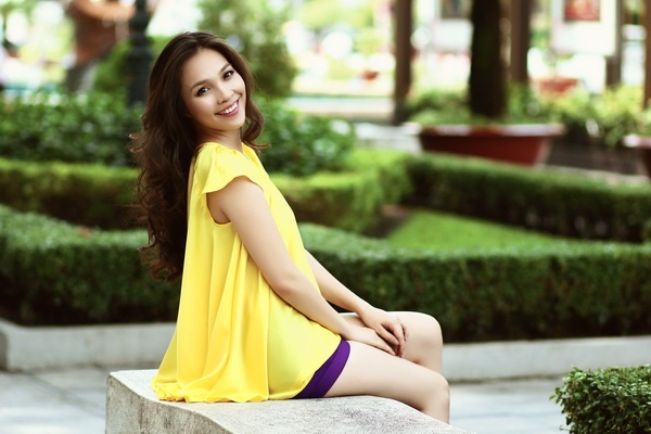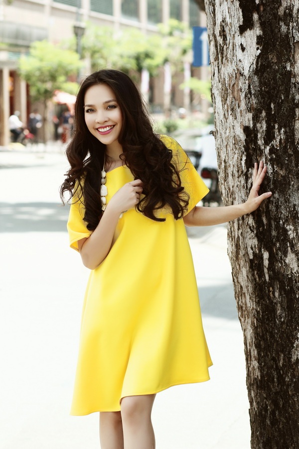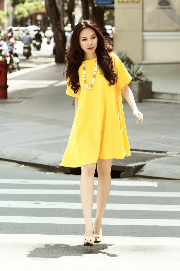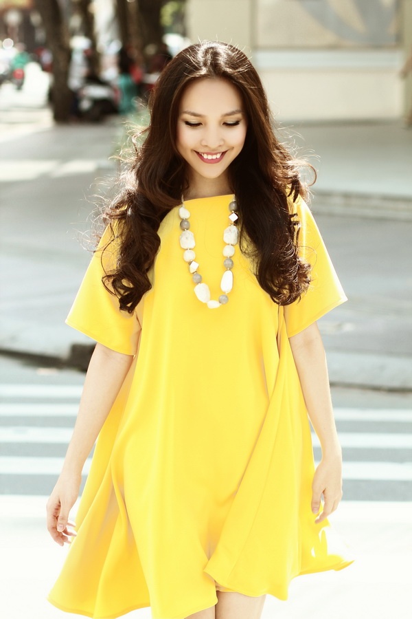 Thiết kế tông màu vàng khá nền nã và duyên dáng, kết hợp ăn ý với mái tóc xoăn bồng bềnh nữ tính. Hiền Thục nổi bật giữa con phố tấp nập. Trang phục của NTK Thủy Nguyễn.