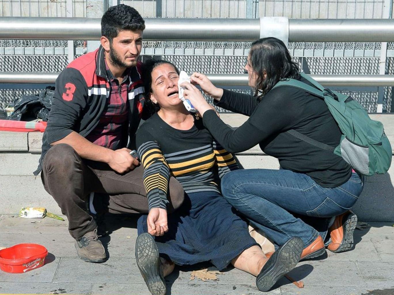 | Hai người đang giúp đỡ một phụ nữ bị thương sau vụ nổ kép tại thủ đô Ankara. Ảnh: Getty |