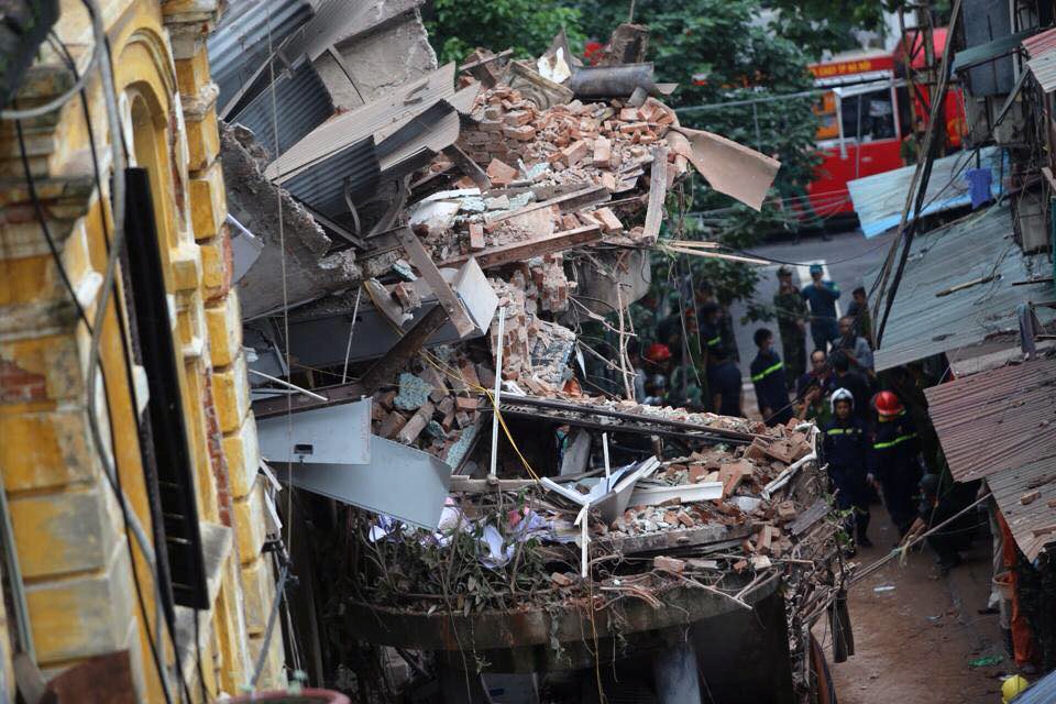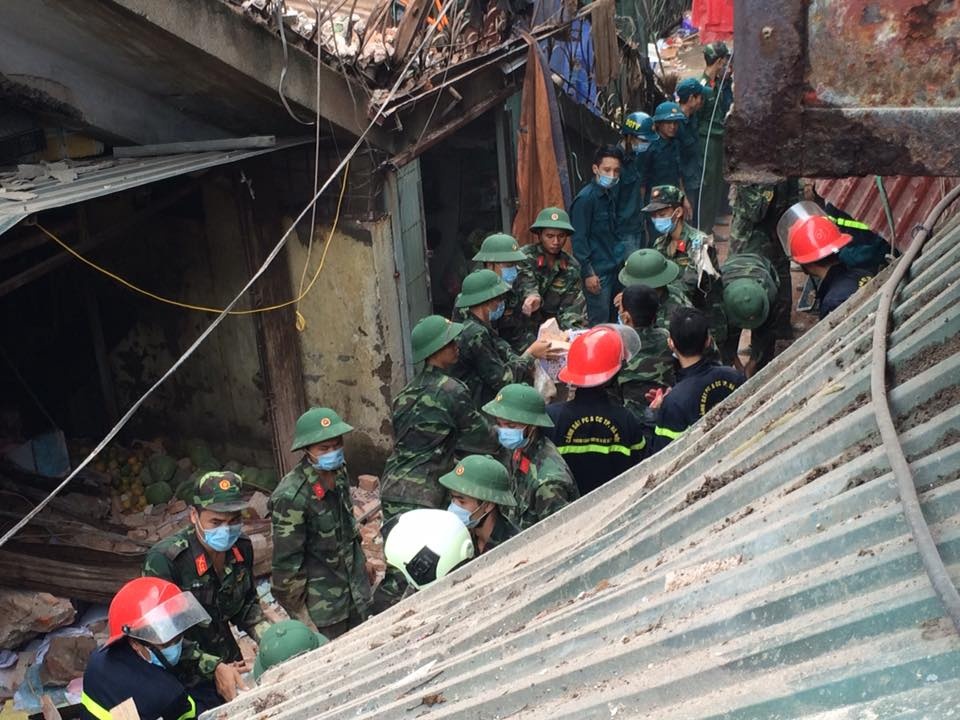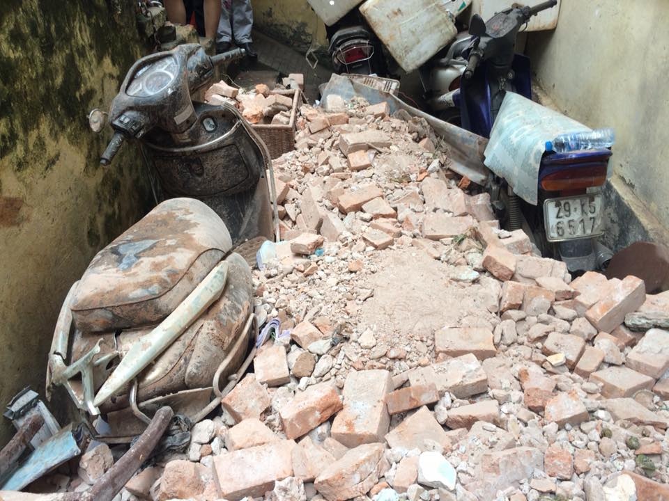Gạch ngói, đất vữa ngổn ngang, nhiều xe máy bị vùi lấp, lực lượng chức năng khẩn trương tìm kiếm nạn nhân trong đống đổ nát giữa thủ đô.