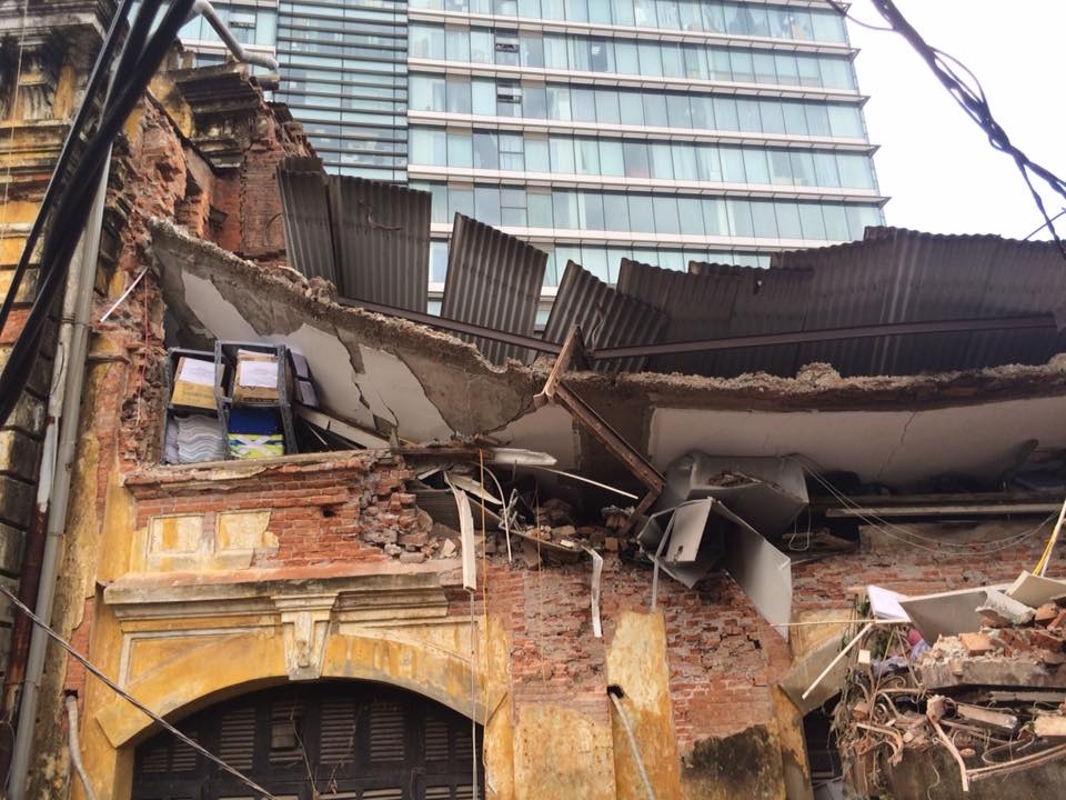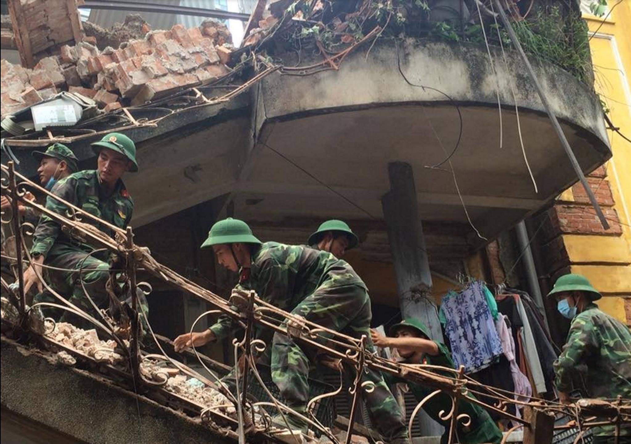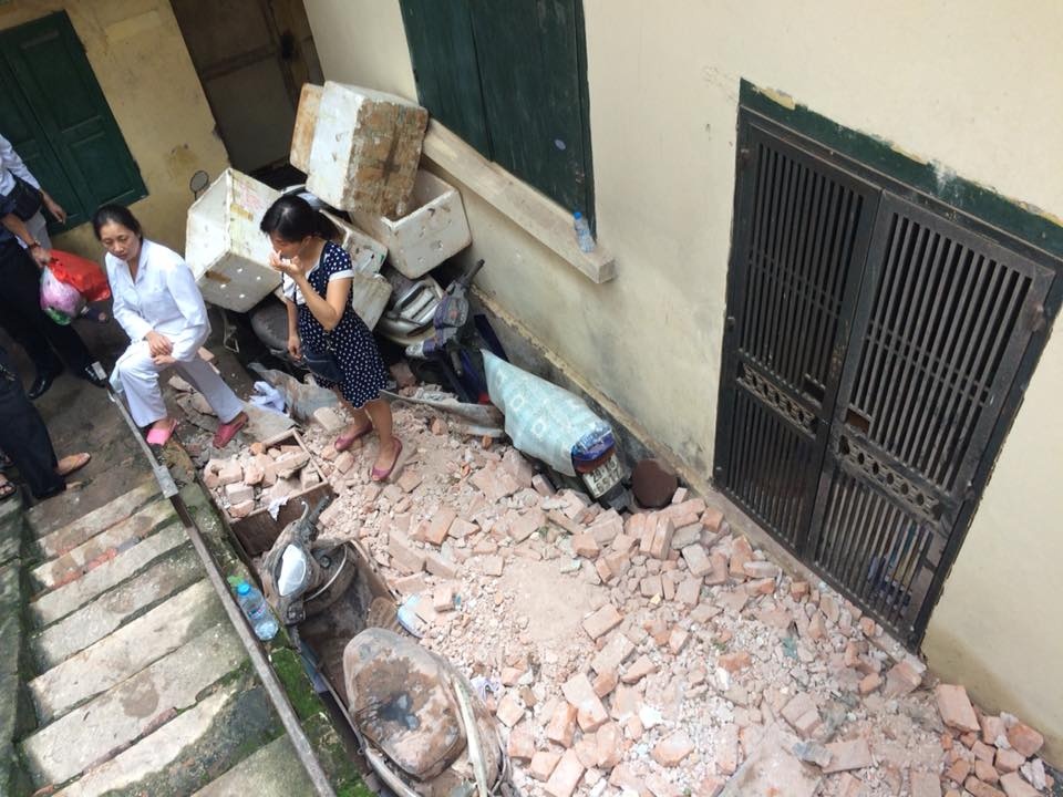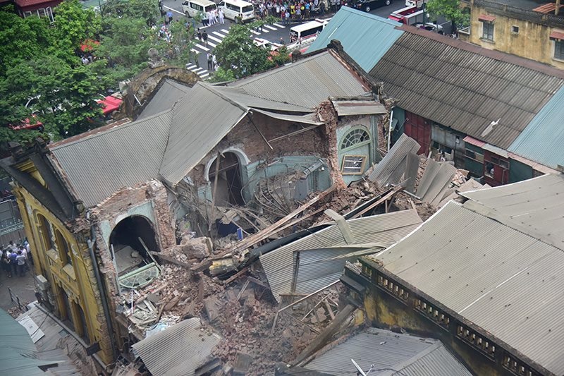 | Sự cố sập mái và tường tầng 2 ngôi nhà cổ thời Pháp xây dựng xảy ra lúc 12h45 tại ngõ nhà 105 - 107 Trần Hưng Đạo, quận Hoàn Kiếm, Hà Nội. |