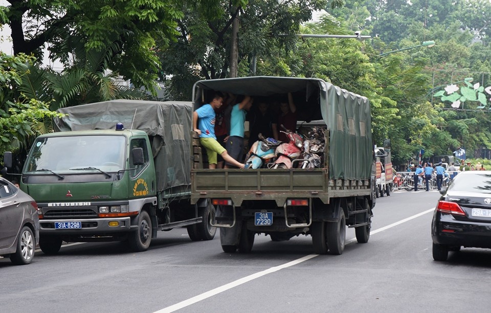 | Công ty môi trường đô thị điều nhiều xe rác đến để chở phế liệu ra khỏi hiện trường. |
