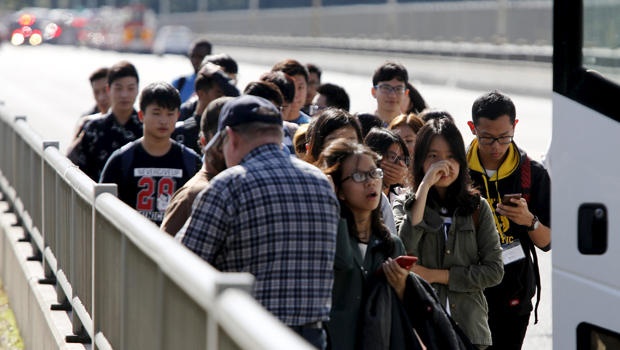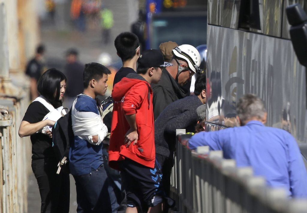 Các sinh viên băng bó tay đứng gần chiếc xe buýt gặp nạn. Ảnh: AP