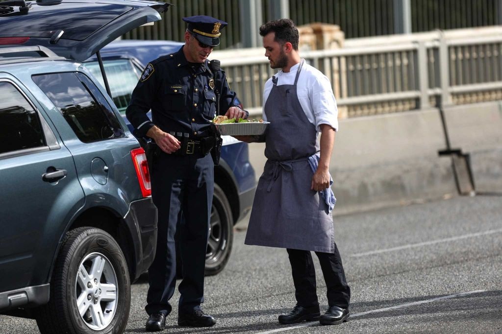 Một nhân viên phục vụ tại nhà hàng Canlis, gần khu vực xảy ra tai nạn, đem đồ ăn tới cho các cảnh sát làm việc tại hiện trường. Ảnh: seattlepi