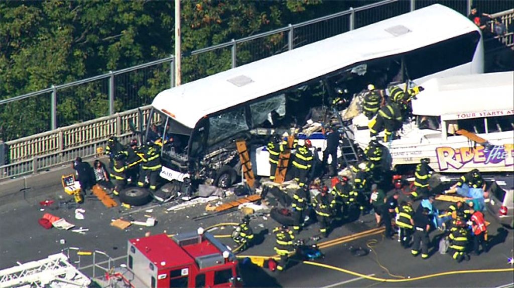 Cảnh tượng hỗn loạn của vụ va chạm nhìn từ trên cao. Trang Nguyễn, 18 tuổi, quốc tịch Việt Nam, may mắn không có mặt trên chiếc xe buýt gặp nạn. Bạn của Trang đi trên xe buýt phía sau xe bị đâm nói với cô rằng 1 hoặc 2 sinh viên Việt Nam bị thương nhẹ trong tai nạn. Ảnh: Komo News