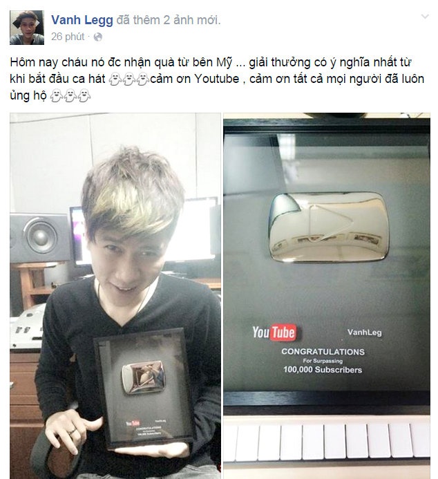 Ngày 4/12, trên Facebook cá nhân của Vanh Leg chia sẻ hình ảnh món quà 9X nhận được từ Youtube là nút Play mạ bạc. Đây là phần thưởng dành cho tài khoản đạt mốc 100.000 lượt đăng ký theo dõi trở lên.