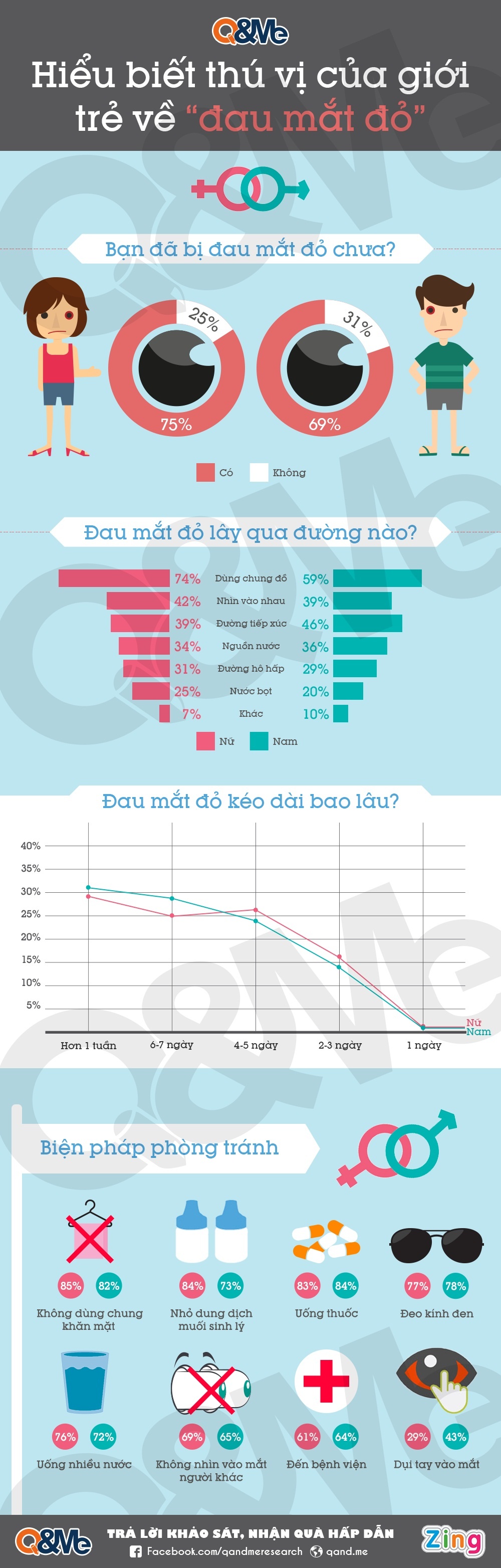 Theo khảo sát này, 75% nữ giới từng mắc bệnh đau mắt đỏ, trong khi đó ở nam giới là 69%. Đặc biệt, 43% nam giới chọn dụi tay vào mắt để phòng bệnh.