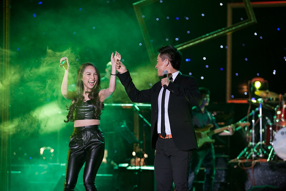 | Khoảnh khắc tình tứ của Tuấn Hưng và Phi Nhung trên sân khấu. Nam ca sĩ tặng giọng ca hải ngoại một chùm hoa phượng vĩ để kỷ niệm lần Hải Phòng biểu diễn. |