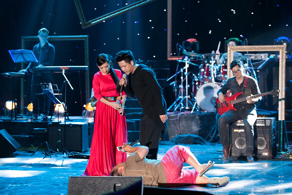 | Hiếu Hiền không ngần ngại nằm xoài trên sân khấu để ghi lại các khoảnh khắc tình tứ của Tuấn Hưng và Phi Nhung. |