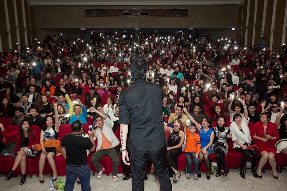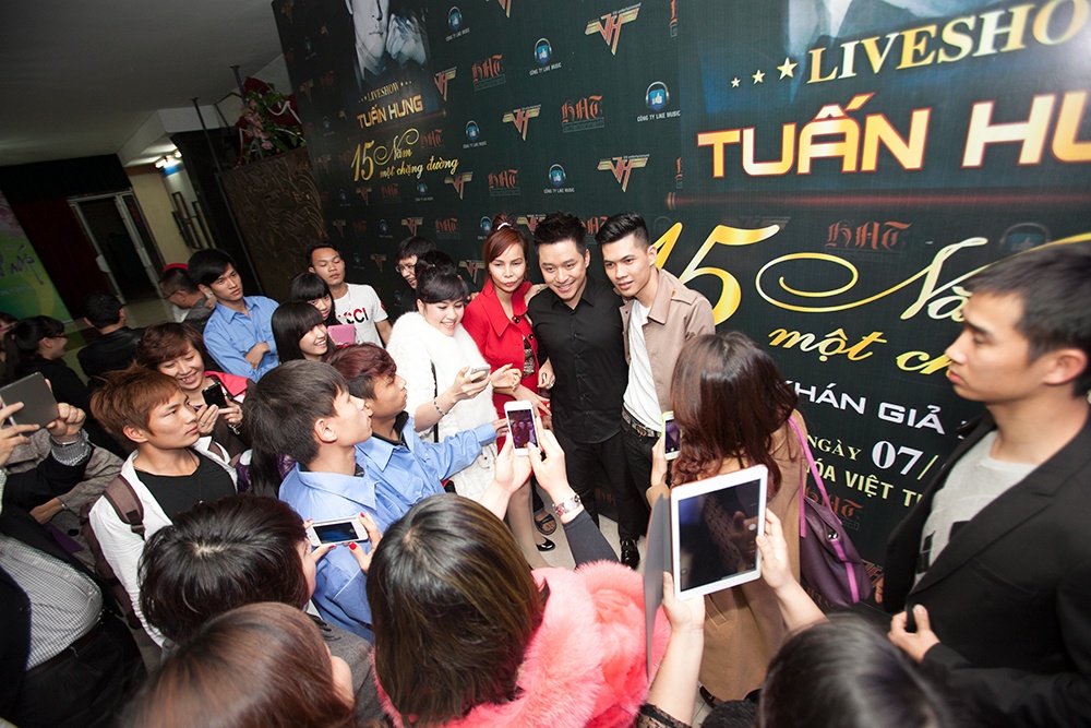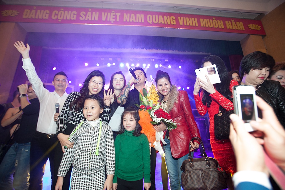 | Khi đêm nhạc kết thúc, rất nhiều người lao lên sân khấu để chup hình và tặng hoa Tuấn Hưng. |