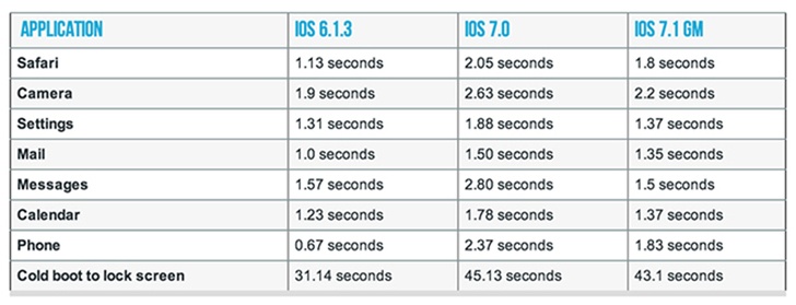 Chẳng hạn, người dùng phải mất khoảng 2,2 giây để mở ứng dụng camera trên iOS 7.1. Con số này với bản iOS 6.1.3 chỉ là 1,9 giây (trên iOS 7.0 là 2,63 giây). Trên thực tế, gần như toàn bộ các ứng dụng mặc định trên máy cài iOS 6 đều có thời gian khởi động nhanh hơn so với iOS 7.1.