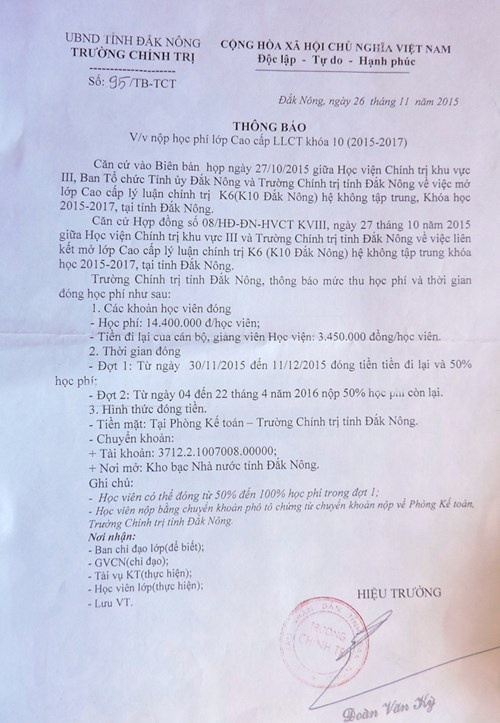 Ngày 26/11/2015, ông Đoàn Văn Kỳ, Hiệu trưởng ký văn bản số 95/TB-TCT về việc yêu cầu nộp các khoản phí cho khóa học. Trong đó, các khoản mà 90 học viên phải đóng có tiền học phí 14,4 triệu đồng/học viên; tiền đi lại cho giảng viên gần 3,5 triệu đồng/học viên (tương đương hơn 300 triệu đồng/khóa).
