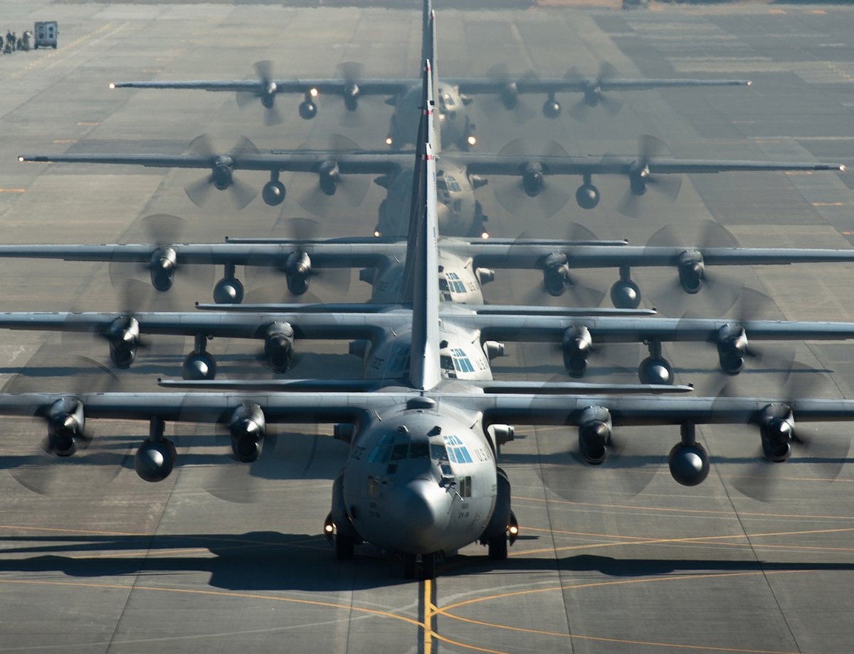 | 6 chiếc C-130 Hercules xếp hàng trên sân băng tại căn cứ quân sự Yokota, Nhật Bản. Ảnh: Airmen. |