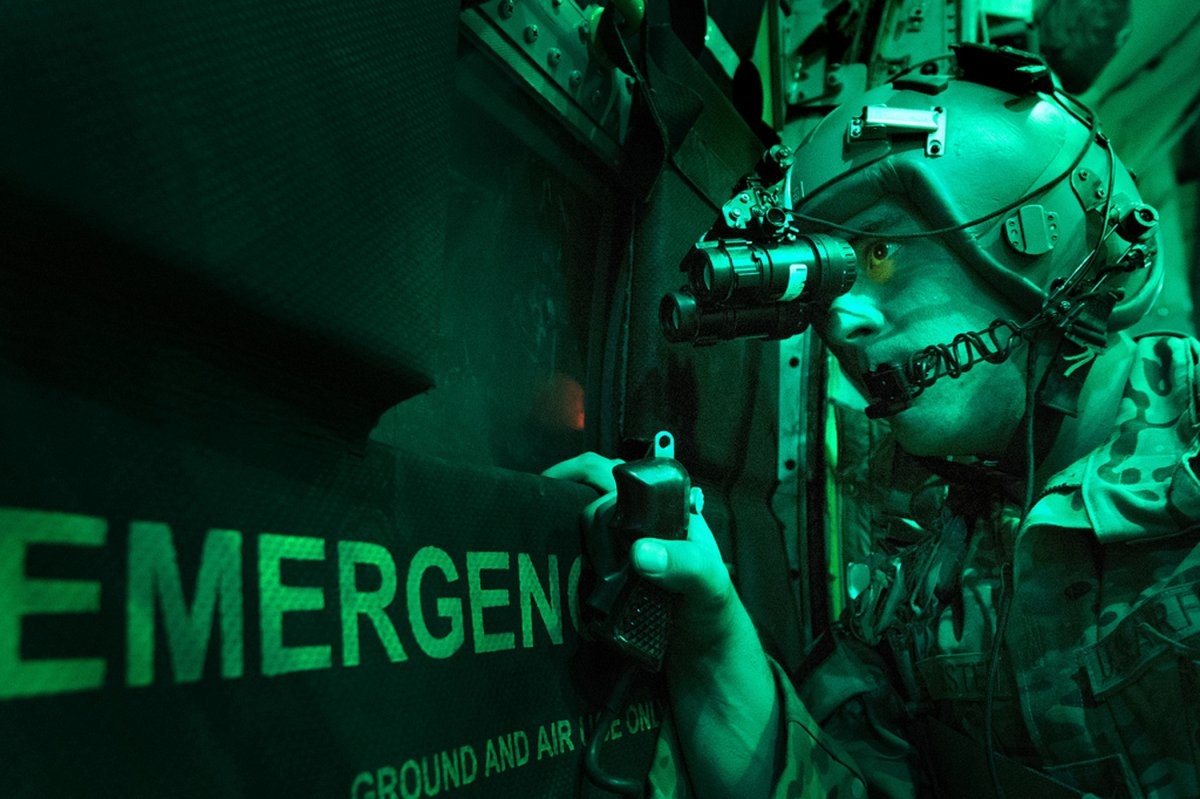 | Phi công Larry Webster dùng kính nhìn đêm để kiểm tra các nguy cơ sau một đợt thả dù hàng hóa ở tỉnh Ghazni, Afghanistan. Ảnh: Airmen. |