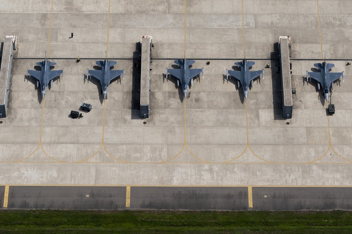 | Hàng chục chiếc F-16 đỗ trên đường băng tại căn cứ không quân Kunsan, Hàn Quốc. Ảnh: Airmen. |
