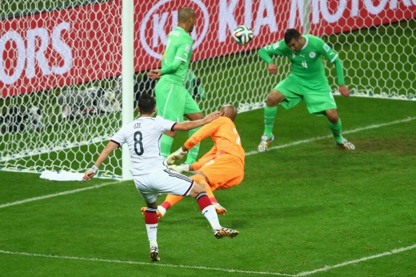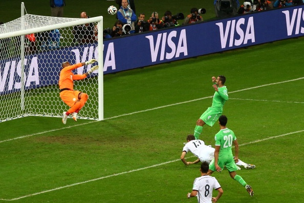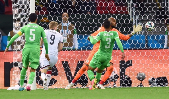 | Cú đánh đầu đưa bóng vào góc hiểm của Mueller buộc thủ thành Mbolhi phải trổ tài cứu thua cho Algeria. |