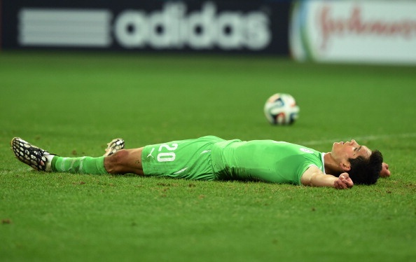 | Nỗi buồn bại trận của các cầu thủ Algeria sau trận đấu kiên cường. |
