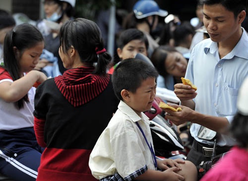 | Một vị phụ huynh đút cho con ăn sáng ngay trước cổng trường. |