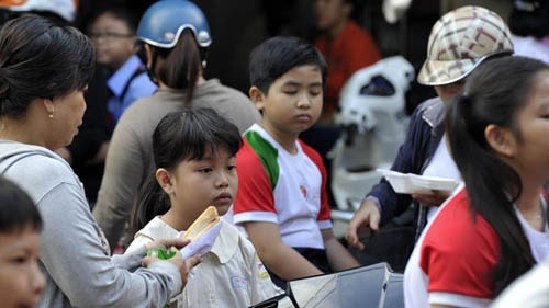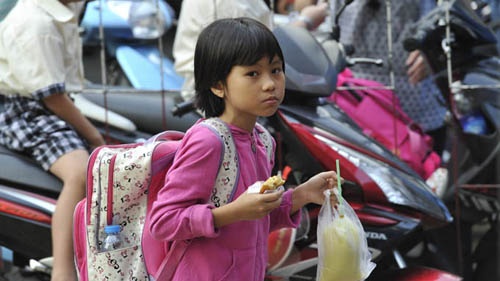 | Sự vội vã thường thấy ở cả phụ huynh và học sinh với đồ ăn sáng trên tay. |