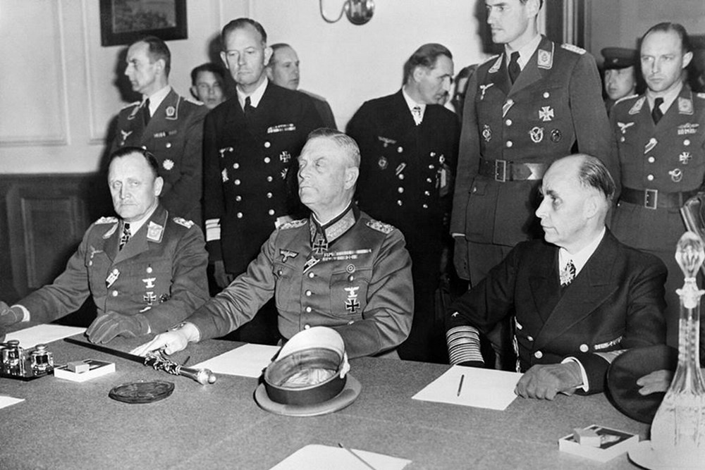 | Đô đốc Karl Donitz, người đứng đầu chính quyền mới ở Đức sau khi Adolf Hitler chết, cử thống chế Wilhelm Keitel ký hiệp định đầu hàng Hồng Quân vô điều kiện trong một cuộc họp ở Karlshot, ngoại ô thủ đô Berlin hôm 8/5/1945. Trước đó một ngày, Đức cũng ký hiệp định đầu hàng Mỹ. Ảnh: Getty |