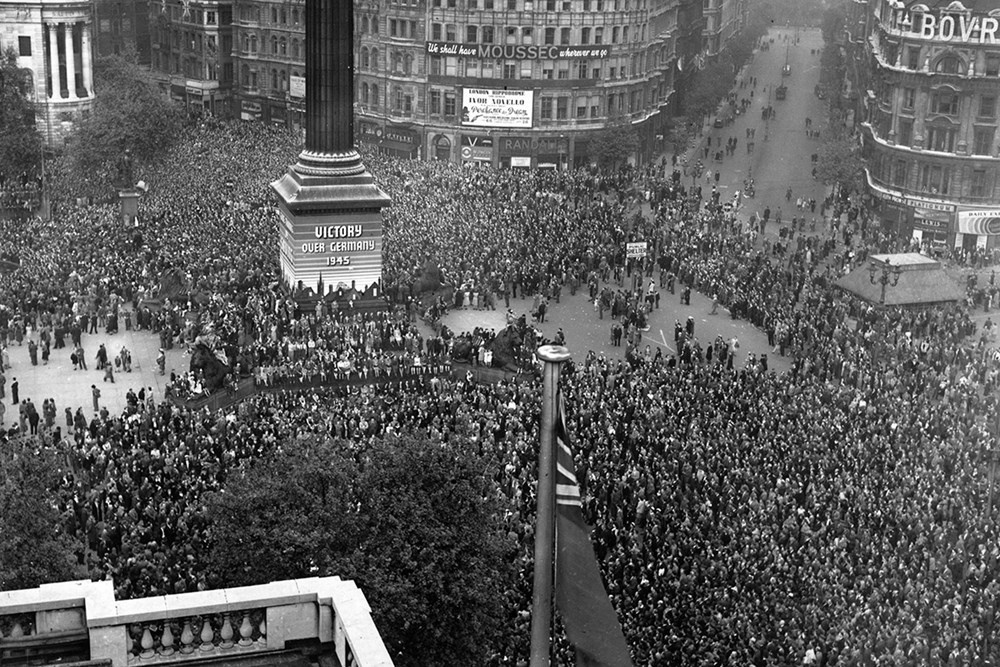 | Ngày 8/5/1945, người dân Anh đổ về quảng trường Trafalgar ở phía đông thành phố London để mừng chiến thắng của quân Đồng minh. Vua George VI, Hoàng hậu Elizabeth Bowes-Lyon và Thủ tướng Wilson Churchill đứng trên ban công Cung điện Buckingham để chia vui cùng dân chúng. Ảnh: Getty Images |