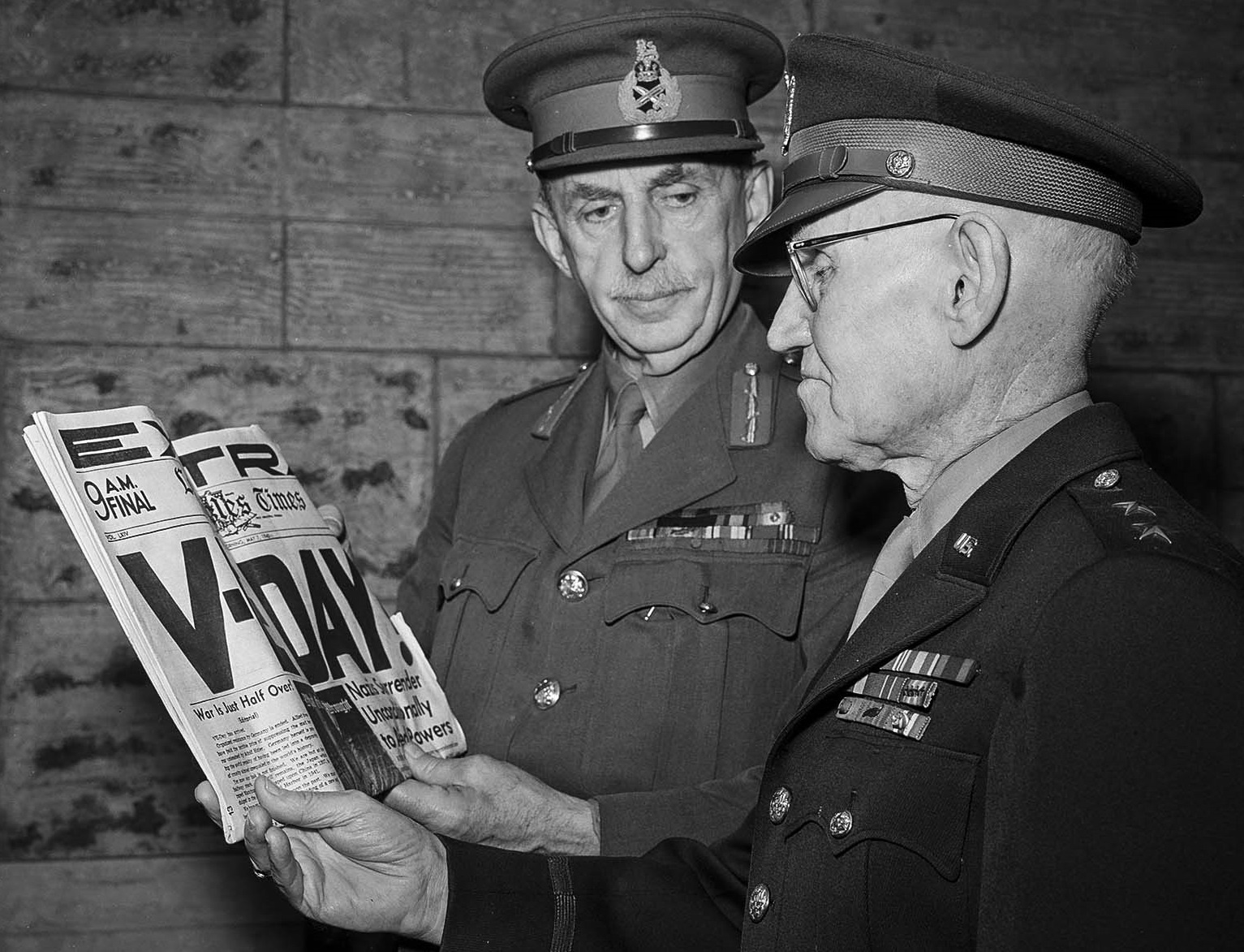 | Ngày 7/5/1945, trung tướng Anh William Dobbie (trái) và Trung tướng nghỉ hưu của quân đội Mỹ Ewing E. Booth, đọc tin Đức đầu hàng. Ảnh: Los Angeles Times |