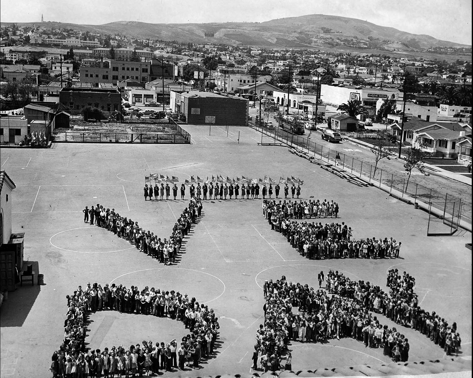 | Học sinh trường Fifteenth Street ở San Pedro, bang California, Mỹ xếp hình chữ VE DAY (Ngày Chiến thắng) trên sân trường vào ngày 7/5. Các giáo viên cầm cờ và đứng phía sau. Ảnh: Los Angeles Times |