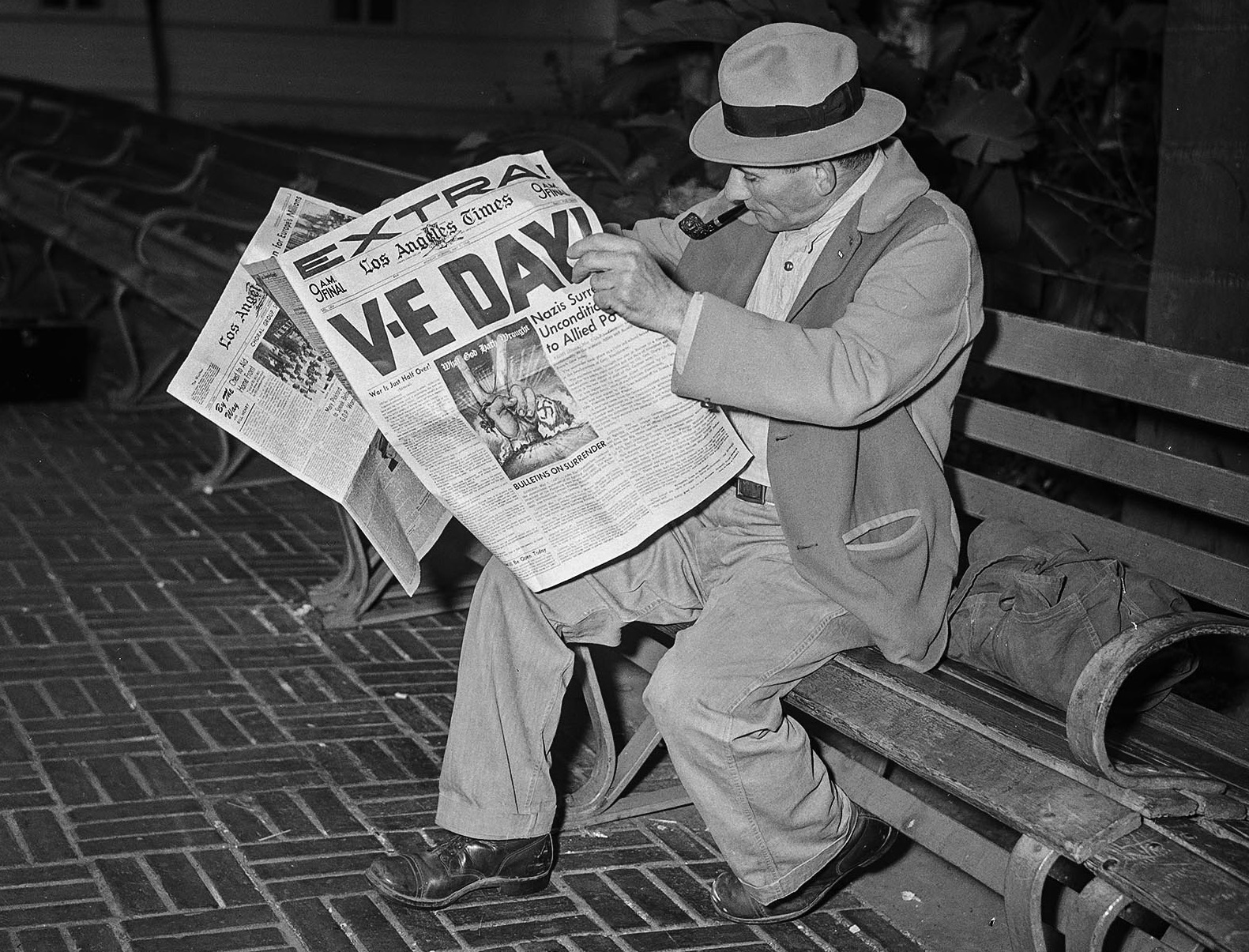 | Morris Simon, một công nhân ngành thép, đọc tin Đức Quốc xã đầu hàng hôm 7/5/1945. Tại thời điểm đó, con trai ông đang ở Đức. Ảnh: Los Angeles Times |