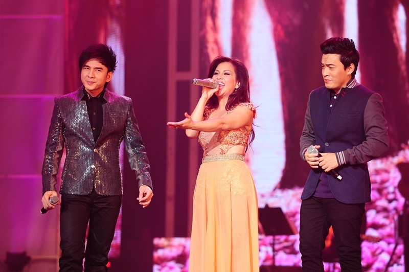 | Cô tái ngộ hai "người tình cũ" là Đan Trường và Lam Trường trong liên khúc Trăm nhớ ngàn thương - Thu sầu. Bộ ba đã cùng nhau trình diễn rất tình tứ. |