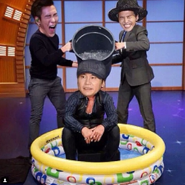 | TOP và G-Dragon hớn hở được dội xô nước đá lên người "bố Yang". Tấm ảnh này của G-Dragon nhận được hơn 421.000 lượt thích. |