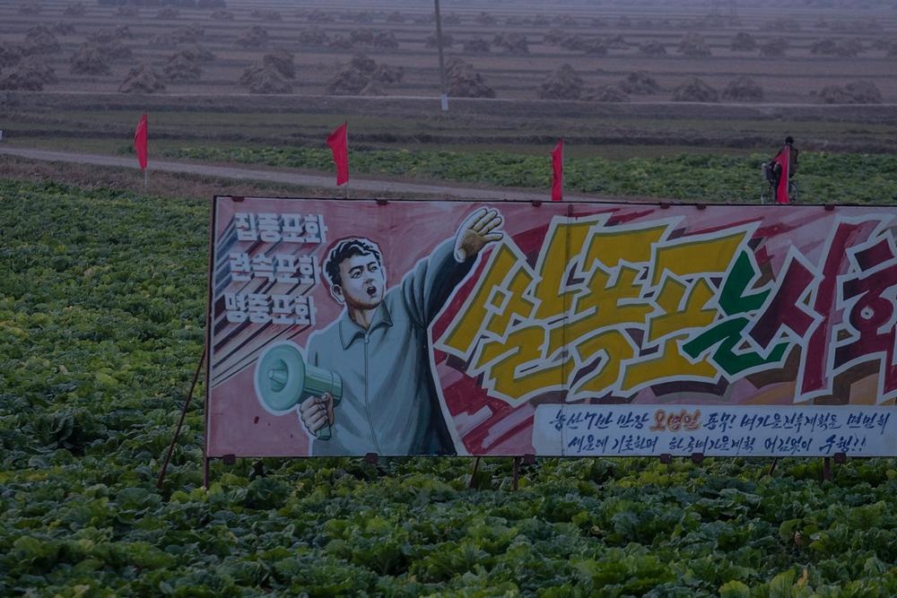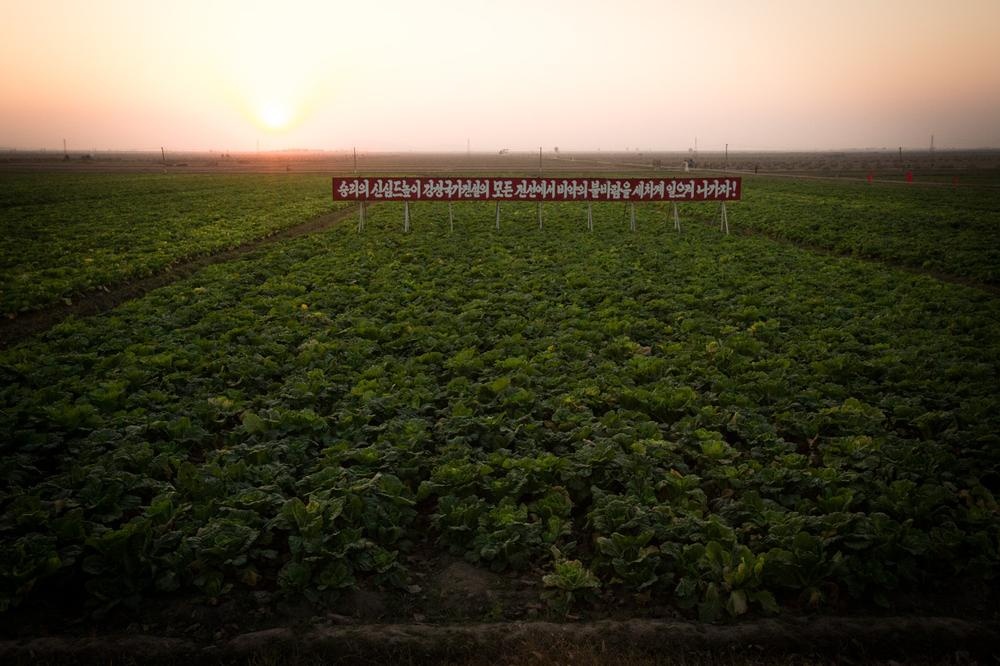 | Một áp phích tuyên truyền đặt giữa cánh đồng rau ở hợp tác xã Migok. Cũng như Hàn Quốc, người Triều Tiên chủ yếu sử dụng bắp cải để làm kimchi. |