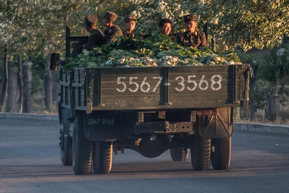 | Nhóm quân nhân Triều Tiên ngồi cùng rau trên xe tải.. |