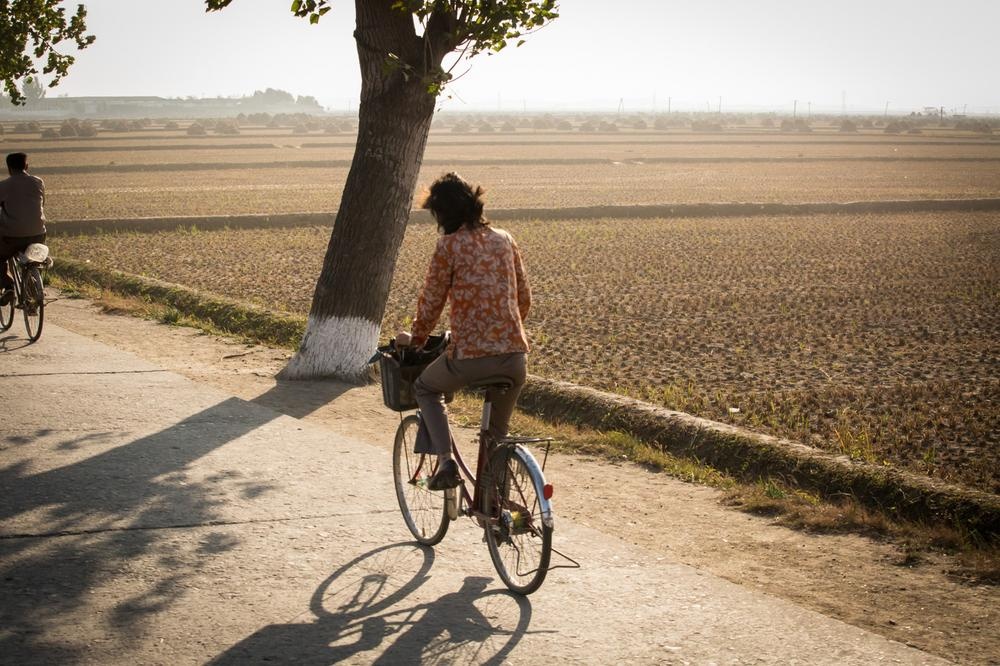 | Người dân đạp xe qua một cánh đồng ở vùng nông thôn. |