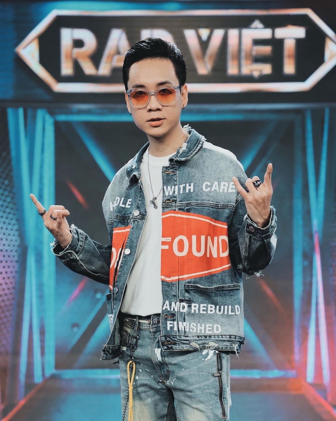 | Justatee đeo kính bản to khi tham gia Rap Việt mùa 3 với vai trò giám khảo. Ảnh: Vie Channel. |