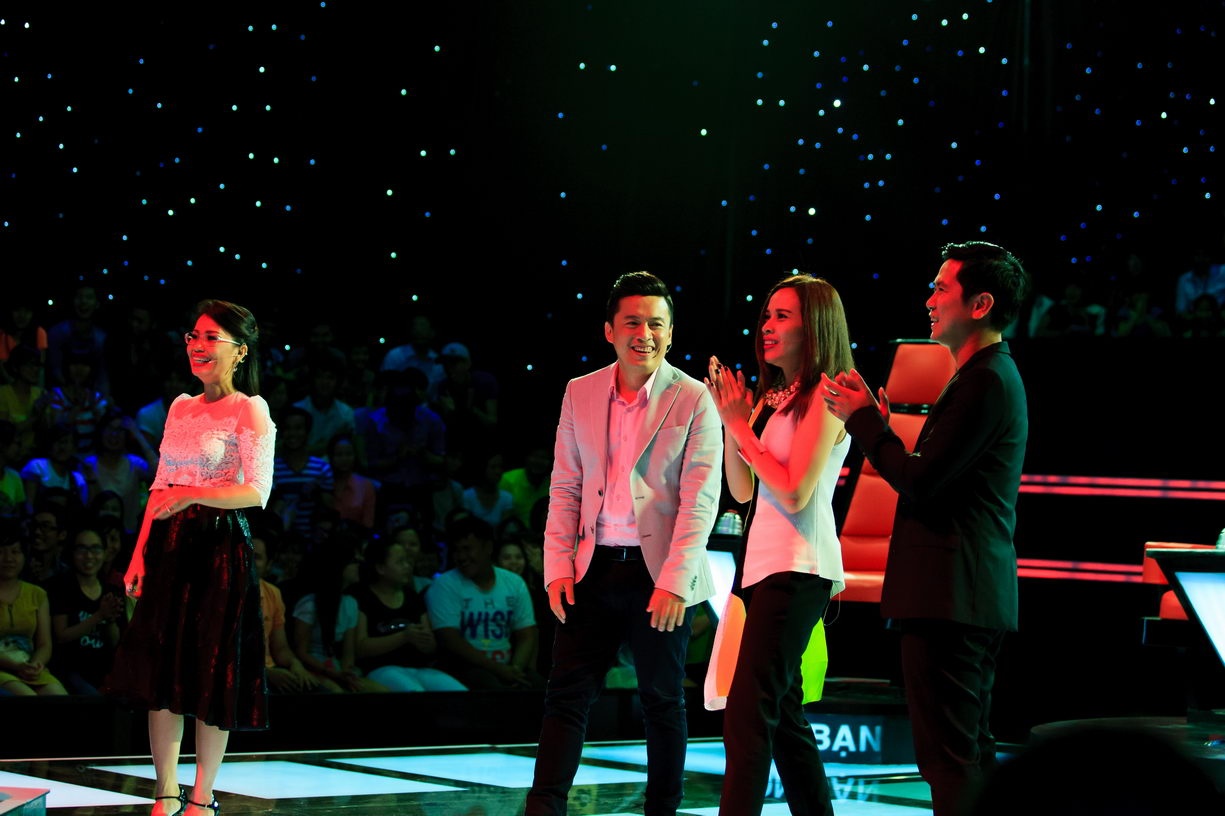 Hồ Hoài Anh - Lưu Hương Giang lên tận sân khấu đón đón Thu Hiền về đội của mình. |