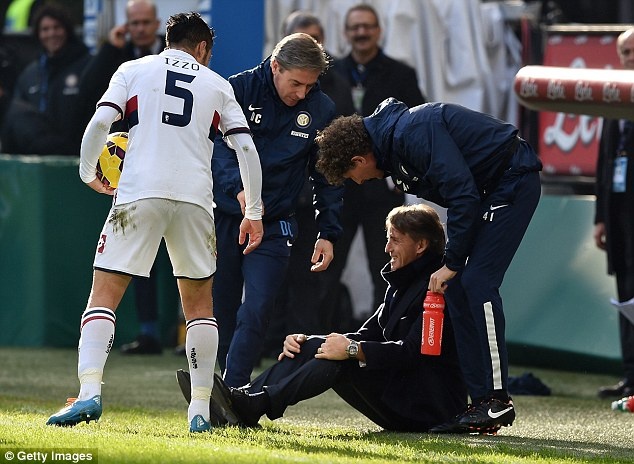 Khi tỷ số đang là 2-0 nghiêng về chủ nhà Inter, các cầu thủ Genoa có pha triển khai tấn công bên cánh trái. Nỗ lực cản phá của hậu vệ Marco Andreolli đưa bóng trúng mặt HLV Mancini đang đứng chỉ đạo bên ngoài đường pitch. Do không kịp phản ứng, chiến lược gia người Ý ngã dúi dụi.