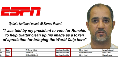 “Chủ tịch Liên đoàn Qatar yêu cầu tôi phải bỏ phiếu cho Ronaldo. Ông ấy làm vậy là để giúp Chủ tịch FIFA Sepp Blatter lấy lại hình ảnh của mình. Đó là hành động đáp nghĩa bởi Blatter đã giúp Qatar giành quyền đăng cai VCK World Cup 2022”, Gazzetta dello Sport trích dẫn câu nói của HLV Zarraa Al Fahad.