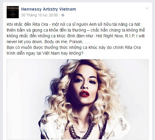 Hôm 30/10, trang fanpage của H-Artistry Việt Nam xuất hiện thông tin úp mở nữ ca sĩ Rita Ora trình diễn tại Việt Nam. "Khi nhắc đến Rita Ora - nữ ca sĩ người Anh sở hữu tài năng ca hát thiên bẩm với giọng ca khỏe khoắn – chắc hẳn chúng ta không thể không nhắc đến những ca khúc đình đám như: Hot Right Now, R.I.P, Body on me…. Bạn có muốn được thưởng thức những ca khúc này do chính Rita Ora trình diễn ngay tại Việt Nam hay không?".