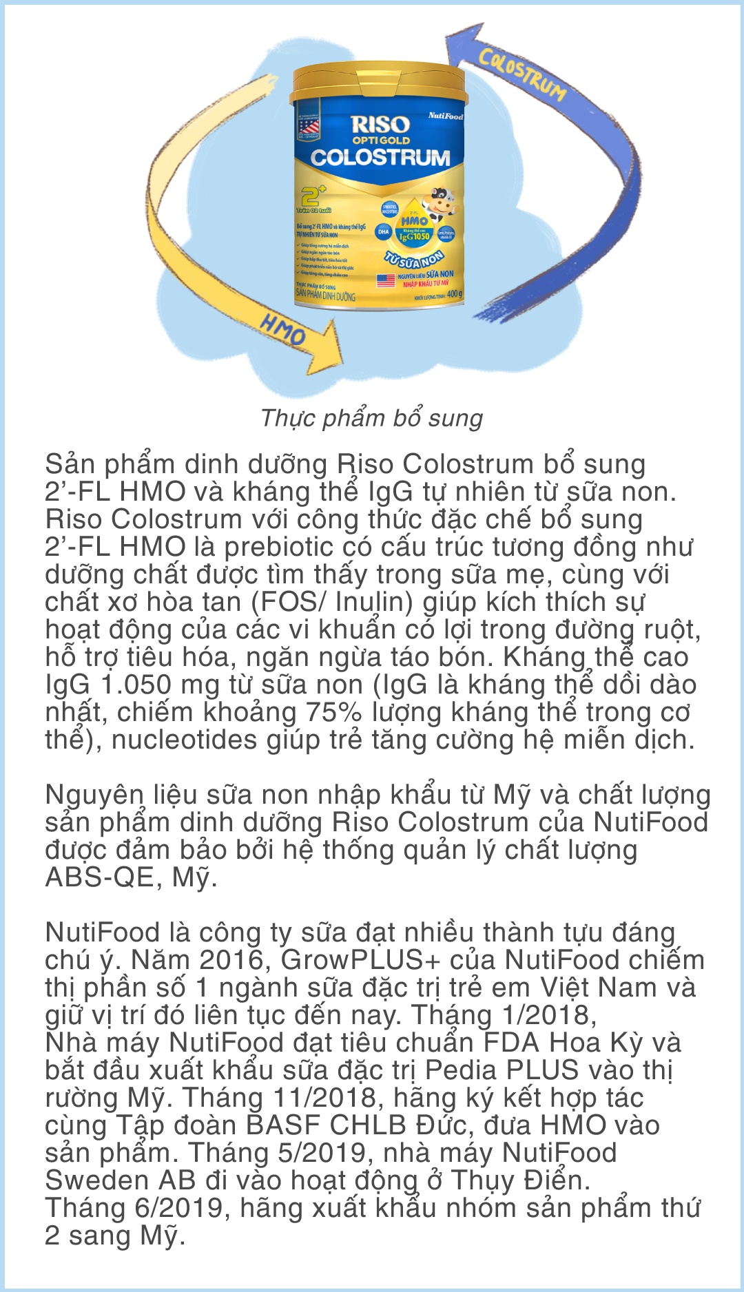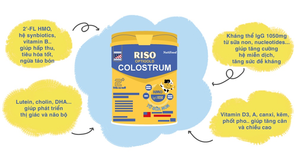 Còn theo các chuyên gia từ Viện Dinh dưỡng NutiFood, sử dụng Riso Opti Gold Colostrum đều đặn, trẻ sẽ có hệ tiêu hoá khoẻ mạnh, ngăn ngừa táo bón, từ đó hấp thu tốt các chất dinh dưỡng và tăng cường sức đề kháng. Sản phẩm còn bổ sung DHA, lutein, canxi, kẽm, vitamin A, phốt pho, vitamin D3 giúp trẻ phát triển não bộ, thị giác, tăng cân và tăng chiều cao.